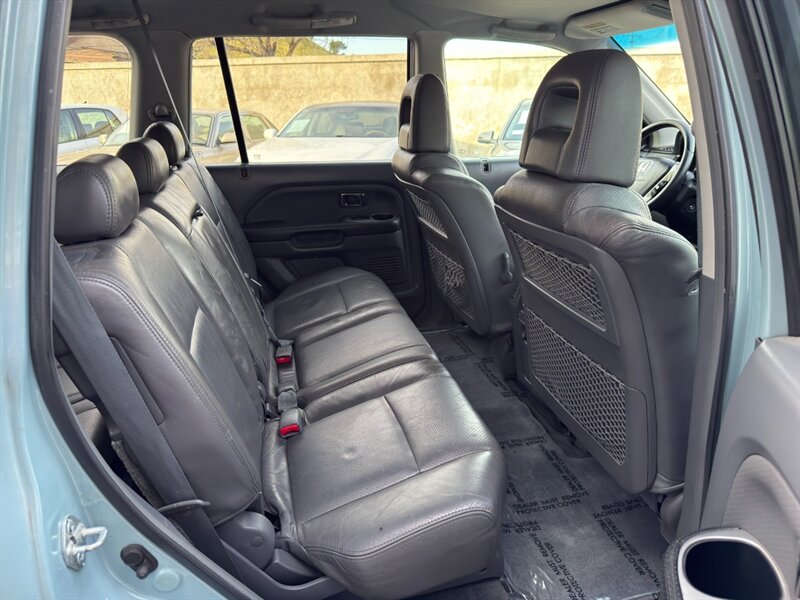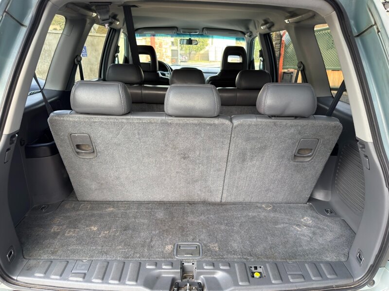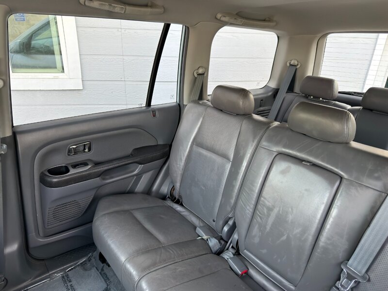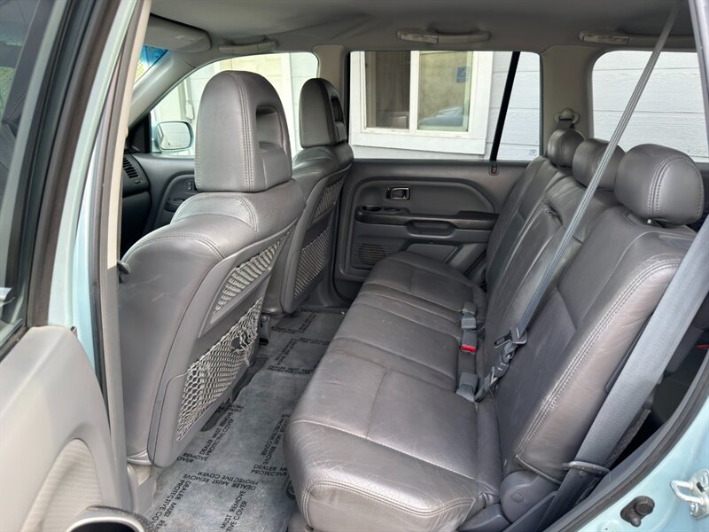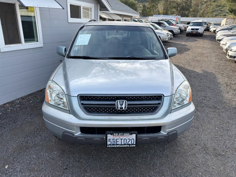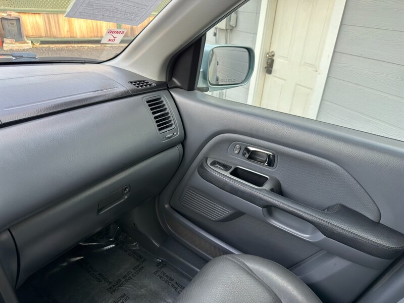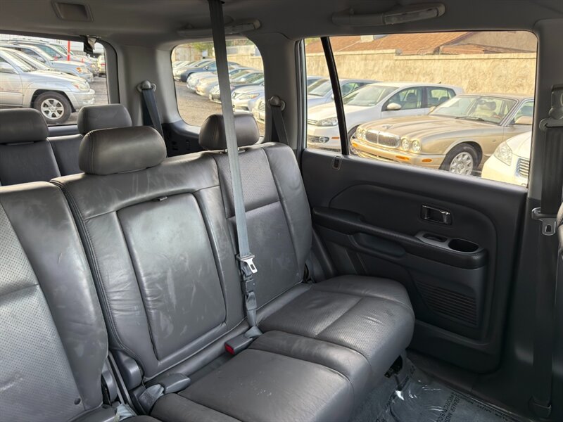 2003 Honda Pilot EX-L powered by a 3.0L naturally aspirated V6 (SOHC, 24-valve) paired with an automatic transmission. Factory equipment includes leather-trimmed seating with a power-adjustable driver’s seat and heated front seats, three-row seating for up to seven passengers, power windows/locks/mirrors, remote keyless entry, cruise control, tilt steering, automatic climate control, AM/FM stereo with CD player, alloy wheels and roof rails, plus ABS and multiple airbags. Exterior: Starlight Silver Metallic; interior: Fern. Fuel economy approximately 15 MPG city / 21 MPG highway. Vehicle is in excellent overall condition.
