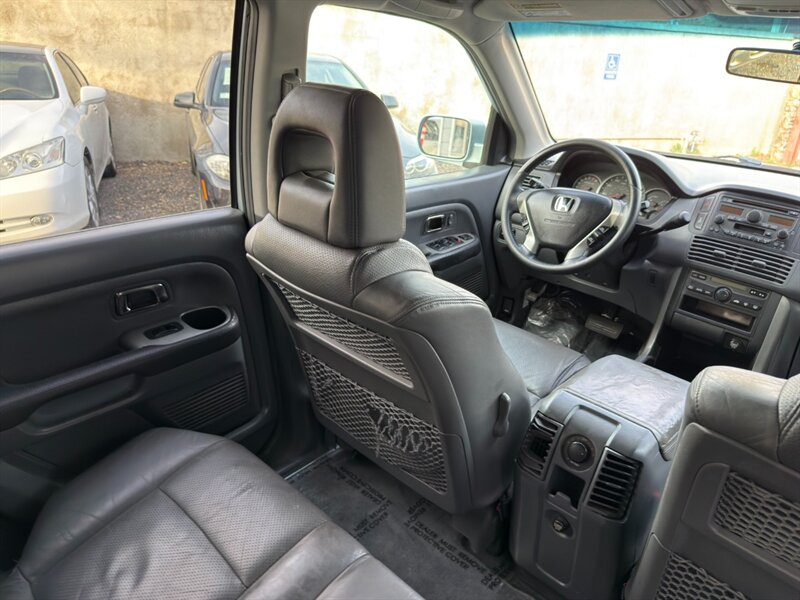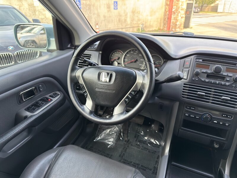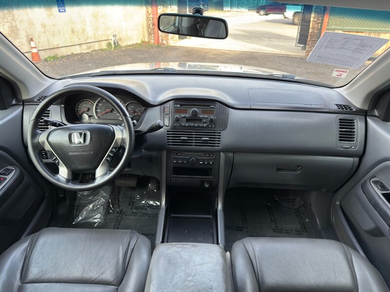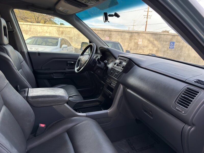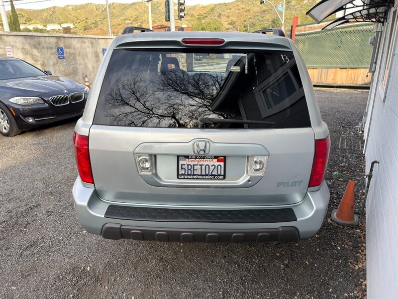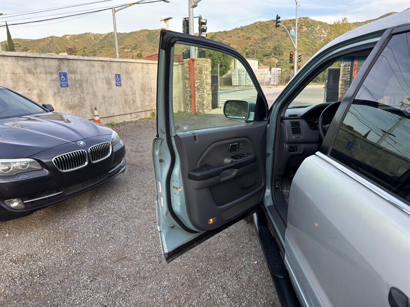 2003 Honda Pilot EX-L con motor V6 de 3.0 L aspirado (SOHC, 24 válvulas) acoplado a transmisión automática. El equipamiento de fábrica incluye asientos tapizados en cuero con asiento del conductor de ajuste eléctrico y asientos delanteros calefactables, tres filas de asientos para hasta siete pasajeros, elevalunas/cerraduras/espejos eléctricos, entrada remota sin llave, control de crucero, columna de dirección inclinable, climatizador automático, radio AM/FM con reproductor de CD, llantas de aleación y barras de techo, además de frenos ABS y múltiples airbags. Exterior: Starlight Silver Metallic; interior: Fern. Consumo aproximado 15 MPG ciudad / 21 MPG carretera. Vehículo en excelente estado general.